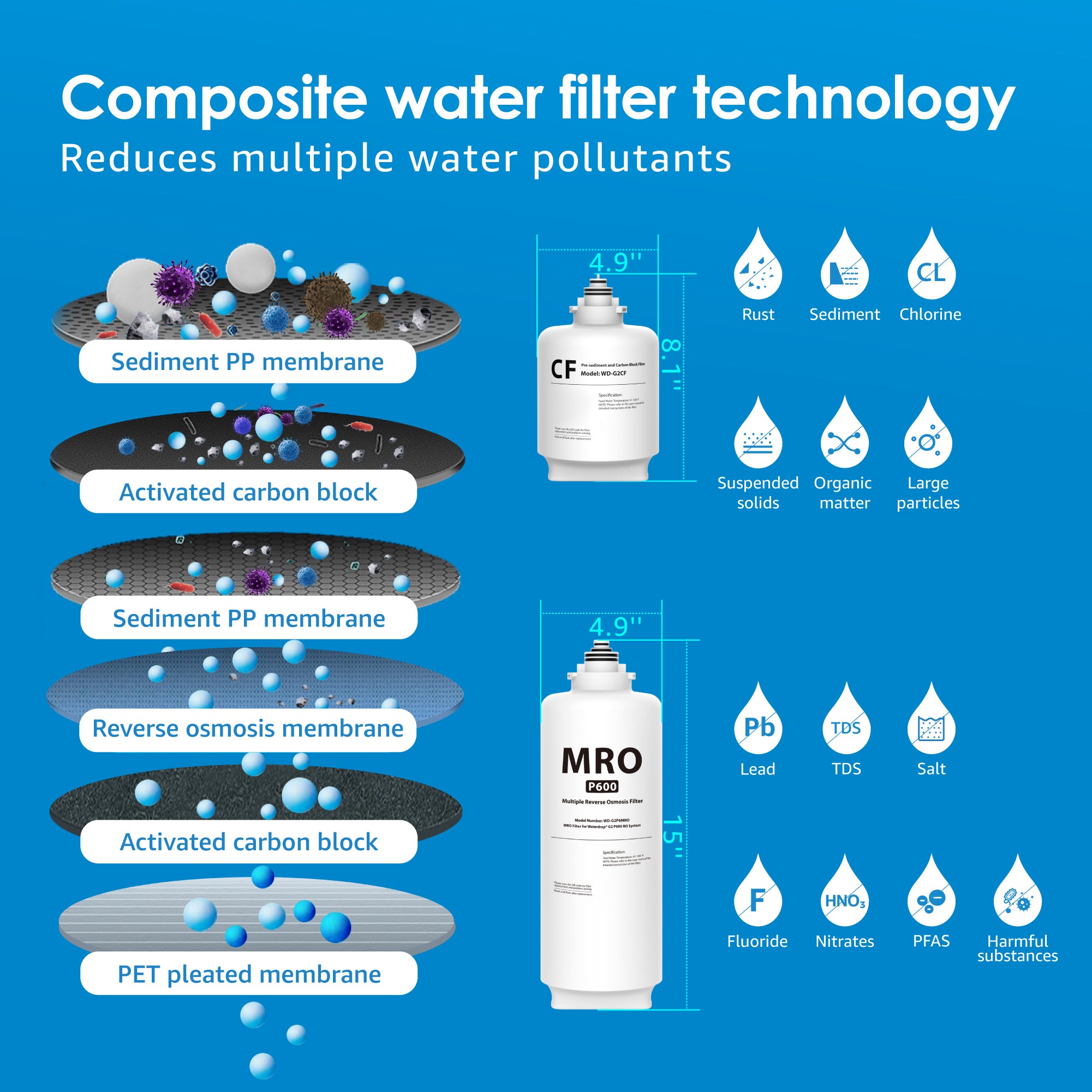 First sediment PP membrane: Reduces rust, sediment, suspended solids, and other large particles.Premium activated carbon block: Reduces chlorine, organic matter, taste and odor, etc. Second sediment PP membrane: Reduces rust, sediment, suspended solids, and other large particles.0.0001-micron high-precision reverse osmosis membrane: Reduces TDS, chloramine, lead, salt, atrazine, fluoride, nitrates, PFAS, bacteria, etc.Post activated carbon block: Reduces taste and odor and improves the taste of water.PET pleated membrane: Further filters out large particles.