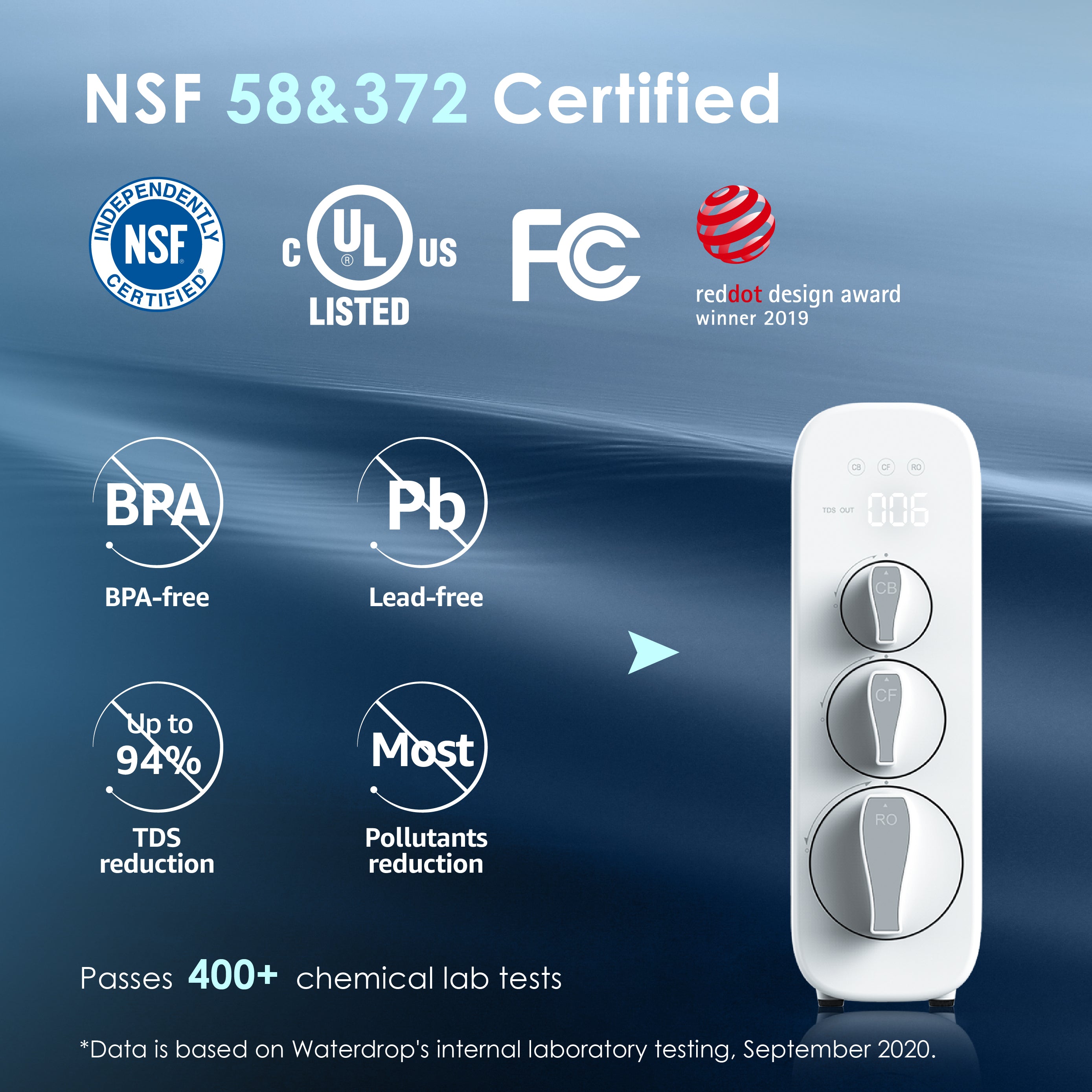 Waterdrop reverse osmosis system is tested and certified against NSF/ANSI standard 58, the TDS reduction rate is up to 91.9%.Tested and certified against NSF/ANSI standard 372, Waterdrop RO system employs lead-free materials, giving you a safe product.