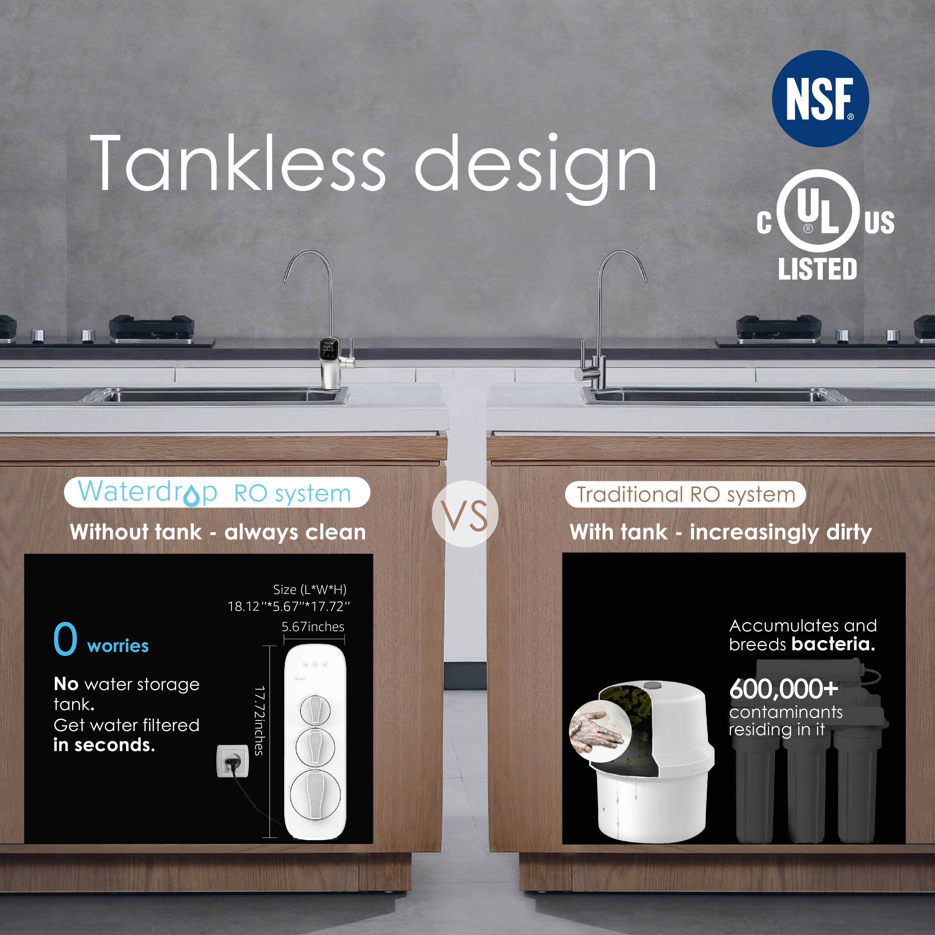 This tankless RO system has a large capacity but still compact in size. It saves more under-sink space.