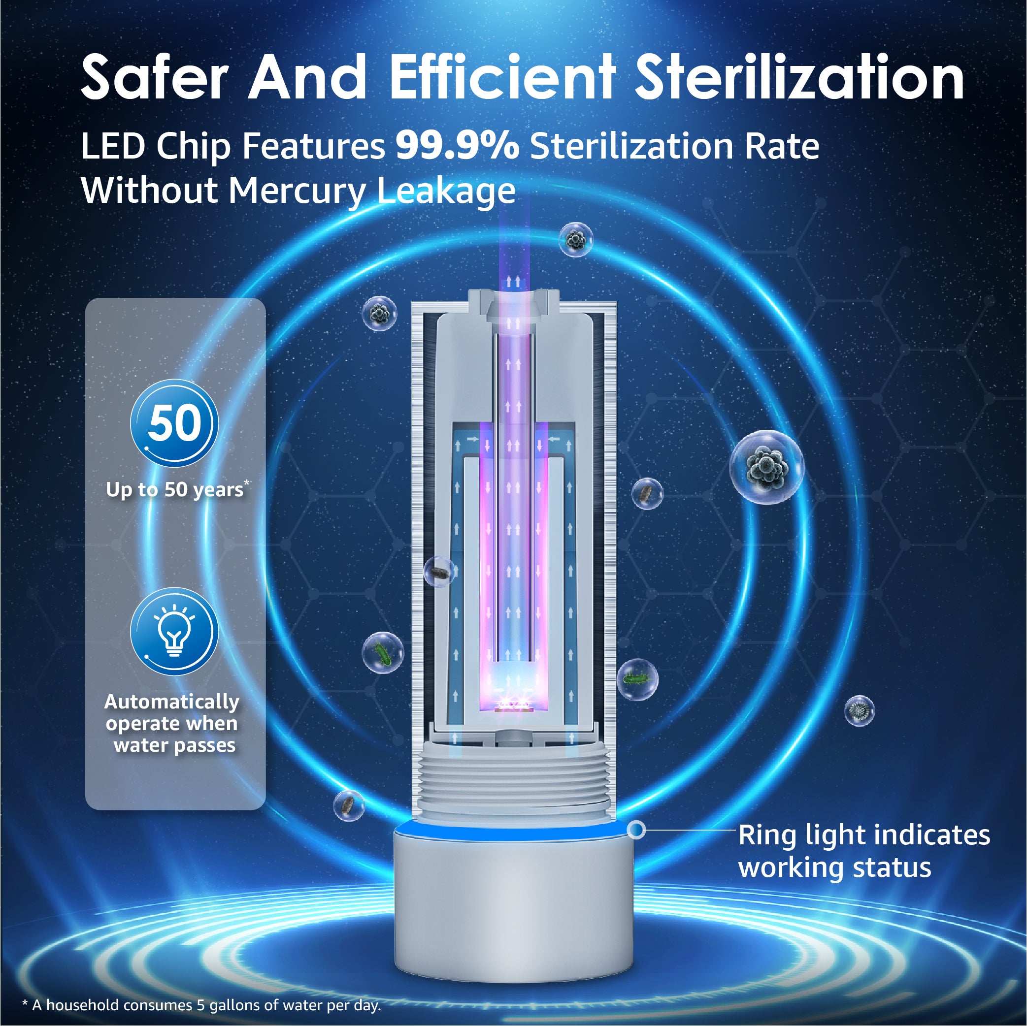 The advanced LED UV chip in this RO system helps to effectively filter 99.9% of bacteria and viruses in your water. Unlike the mercury-vapor lamp, it won’t release harmful toxins and heavy metals.The UV lamp turns on automatically as water passes, helping you save energy.