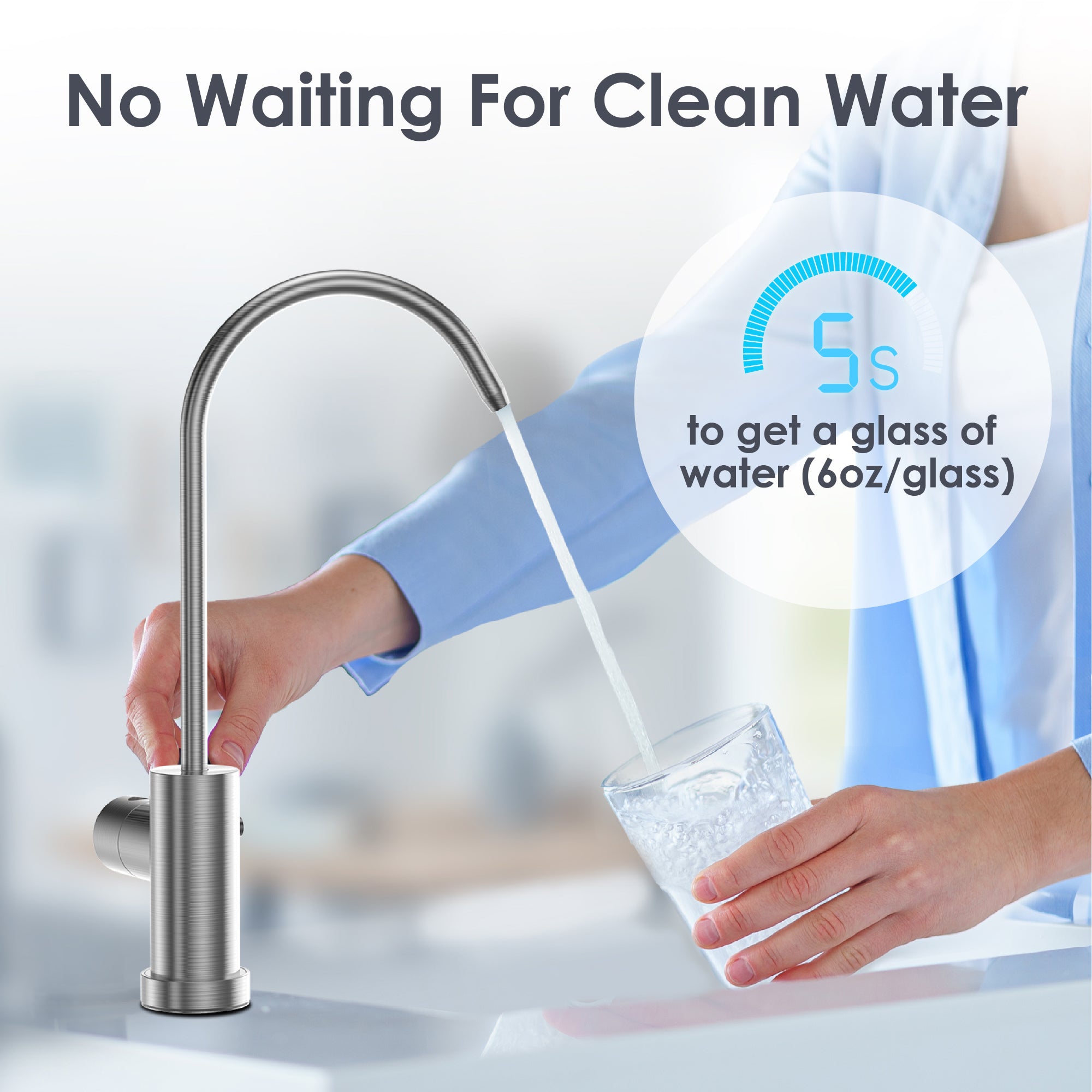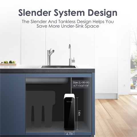 Tankless design prevents bacteria from forming, there by ensuring the freshness of your water.Saves 50% in under-sink space, leaving your kitchen clean and organized