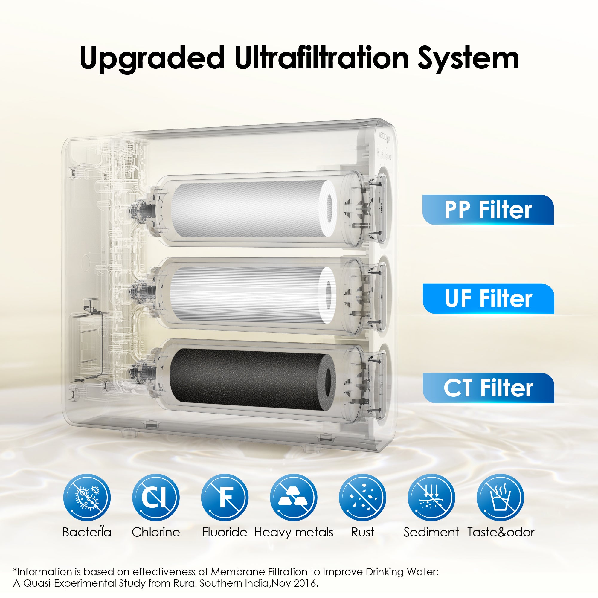The 0.01-micron uf membrane of this ultra-filtration undersink filtration system reduces 99.99% chlorine and effectively adsorb lead, fluoride, heavy metals, VOCs, and much more. This system is not designed for TDS removal.